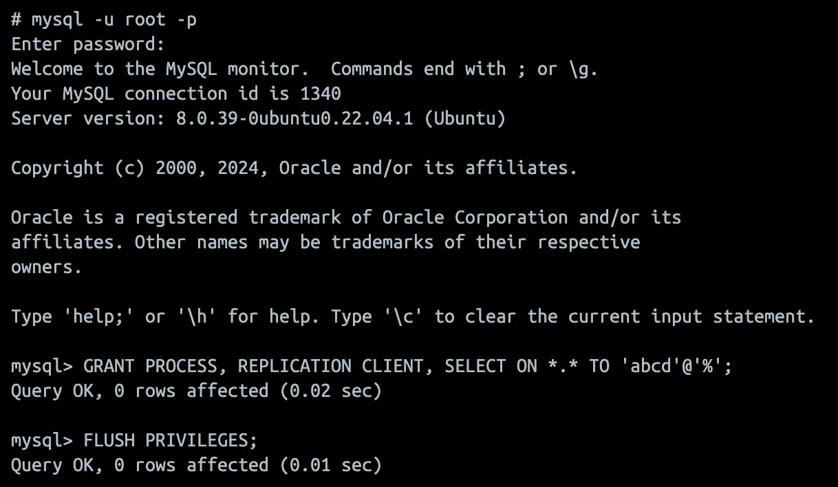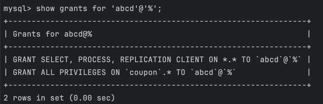 mysql> GRANT PROCESS, REPLICATION CLIENT, SELECT ON *.* TO 'abcd'@'%';