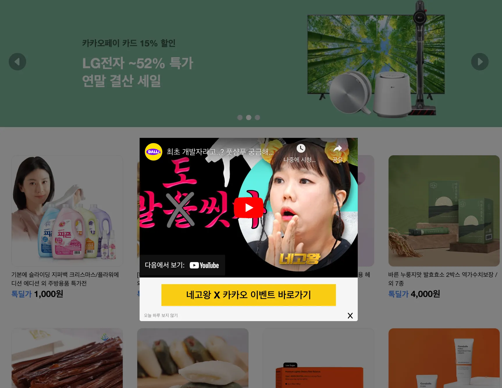 쿠폰 발급 이벤트 페이지와 팝업을 통해 카카오 쇼핑과 프론트엔드가 연동되었다.