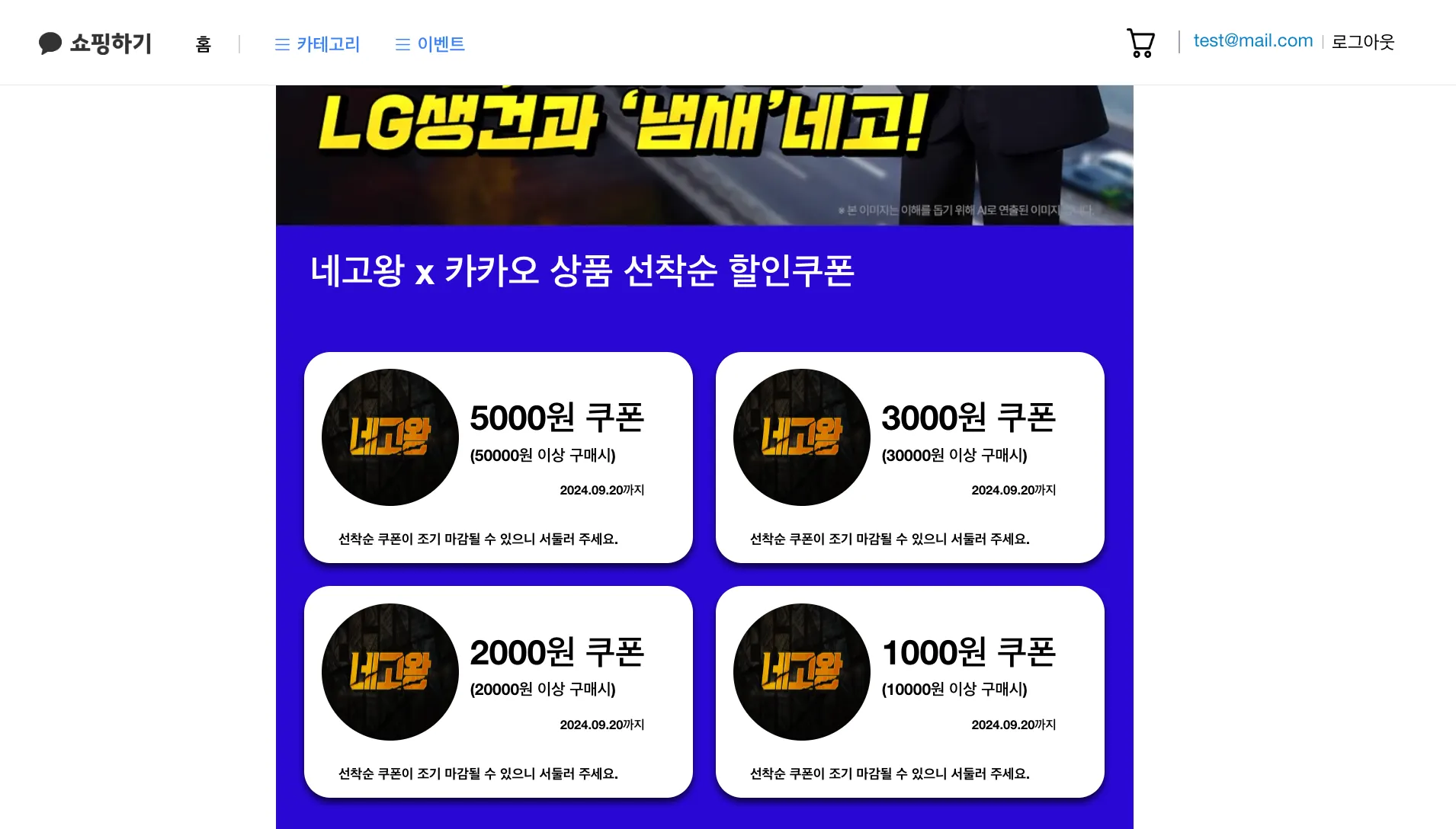카카오 쇼핑 이벤트 페이지를 통해 쿠폰 발급 기능을 구현하고, 사용자의 이메일을 기반으로 userId를 가져와 쿠폰 발급 요청을 처리할 수 있도록 한다.
