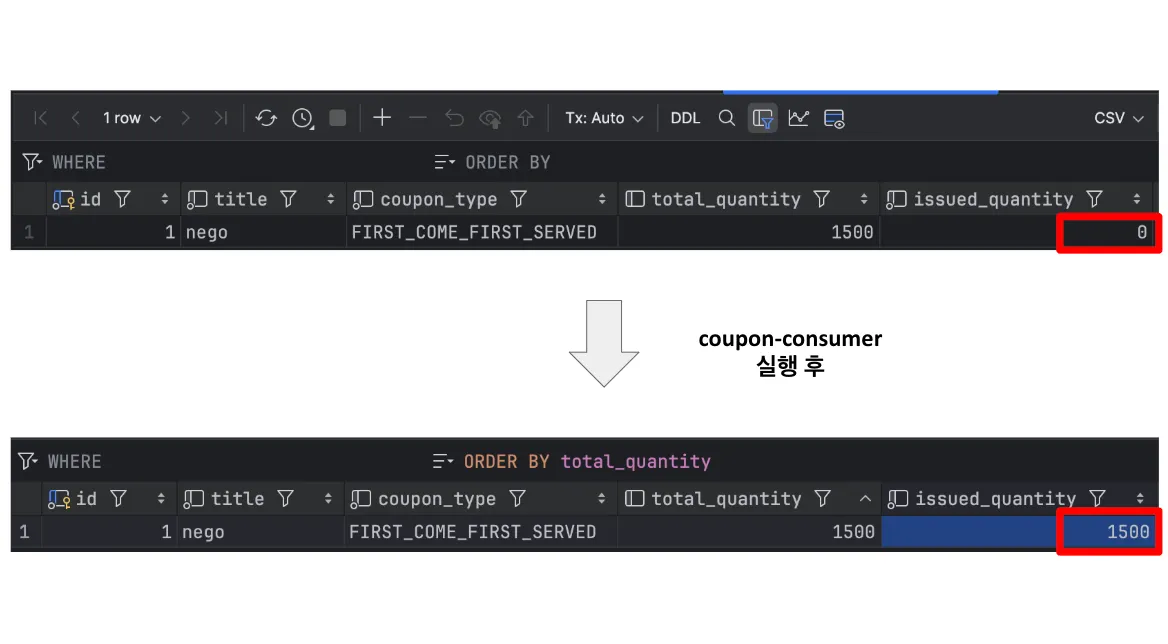 MySQL에 트랜잭션 완료된 데이터 저장 (issued_quantity: 0건 → 1500건)