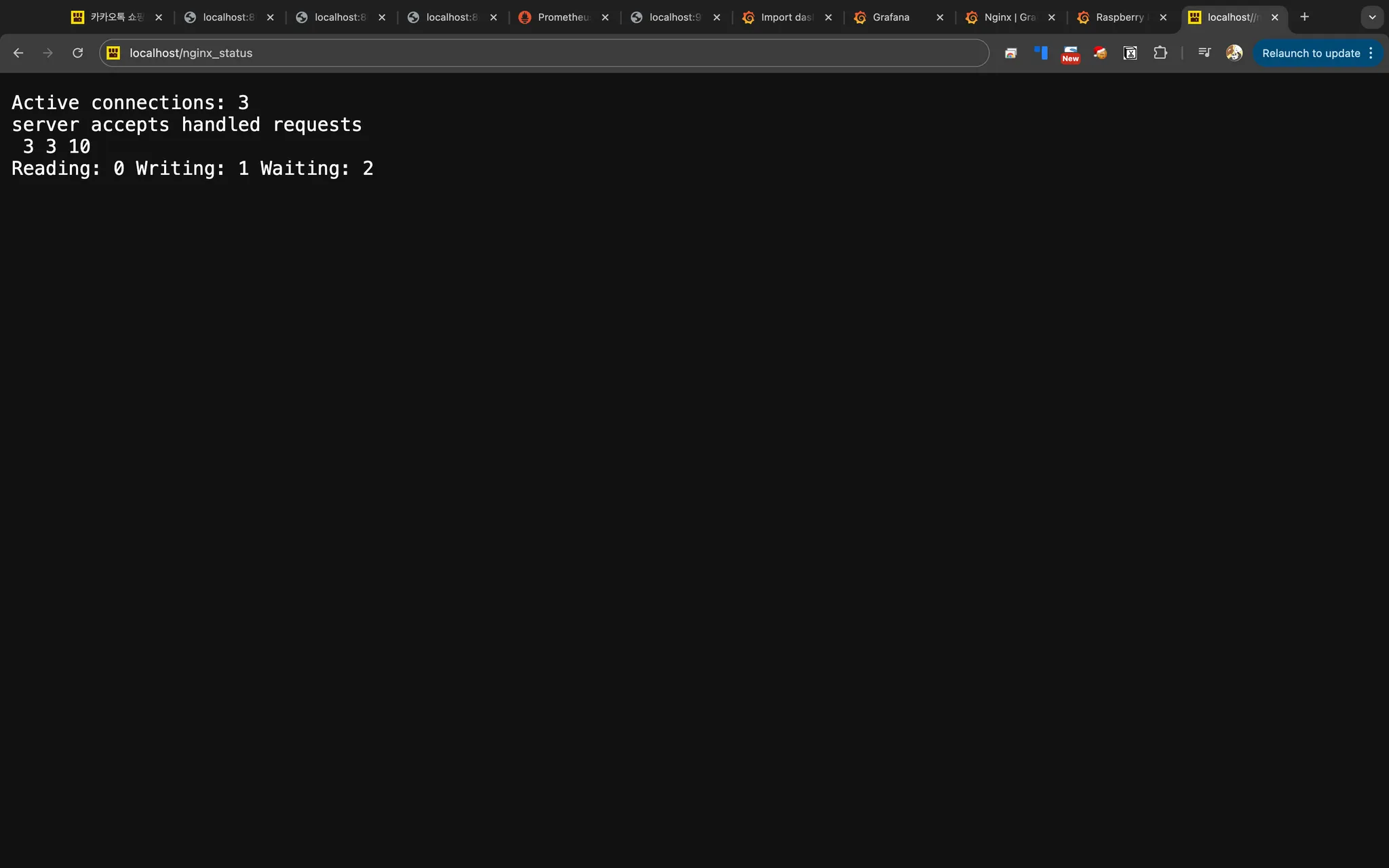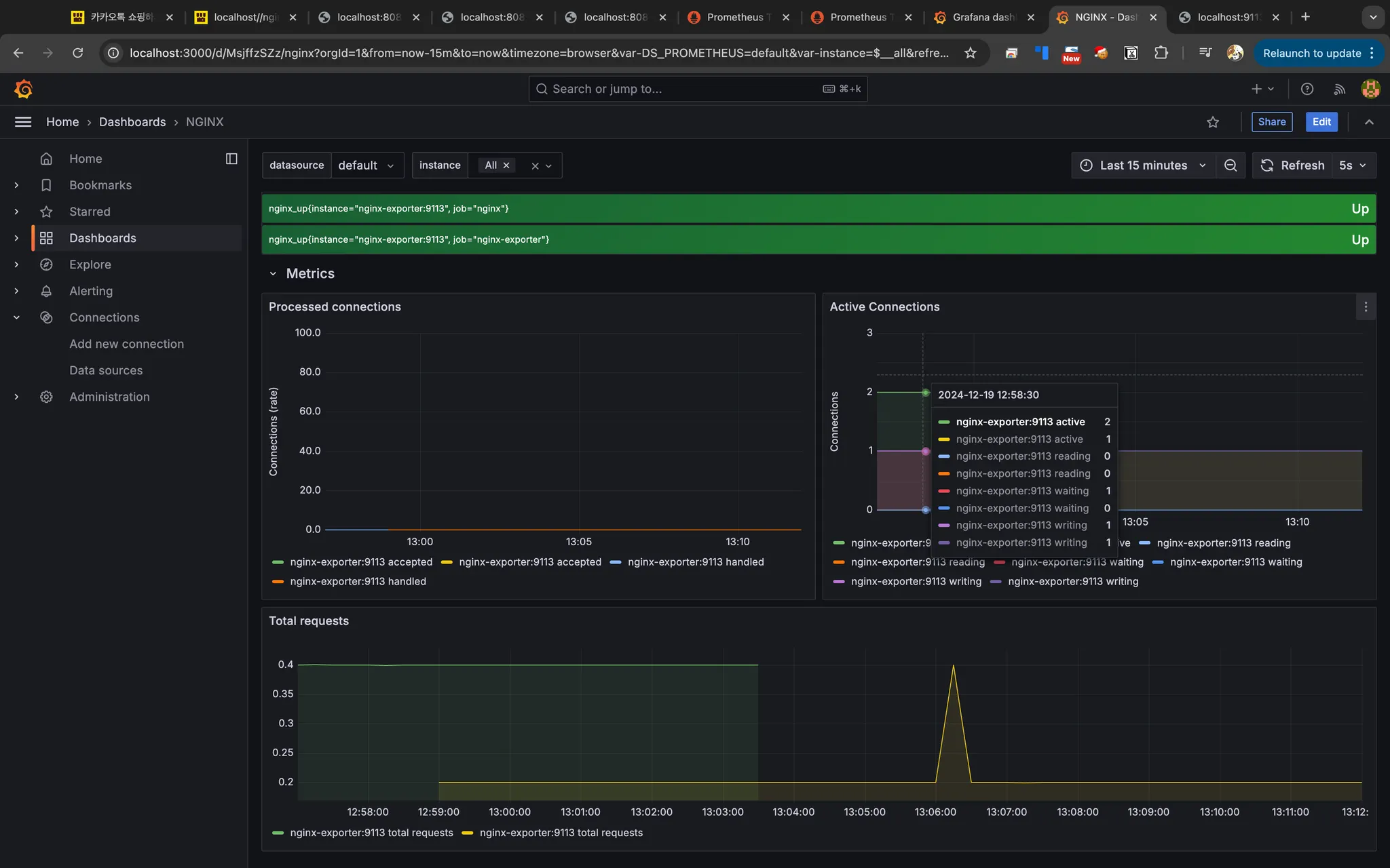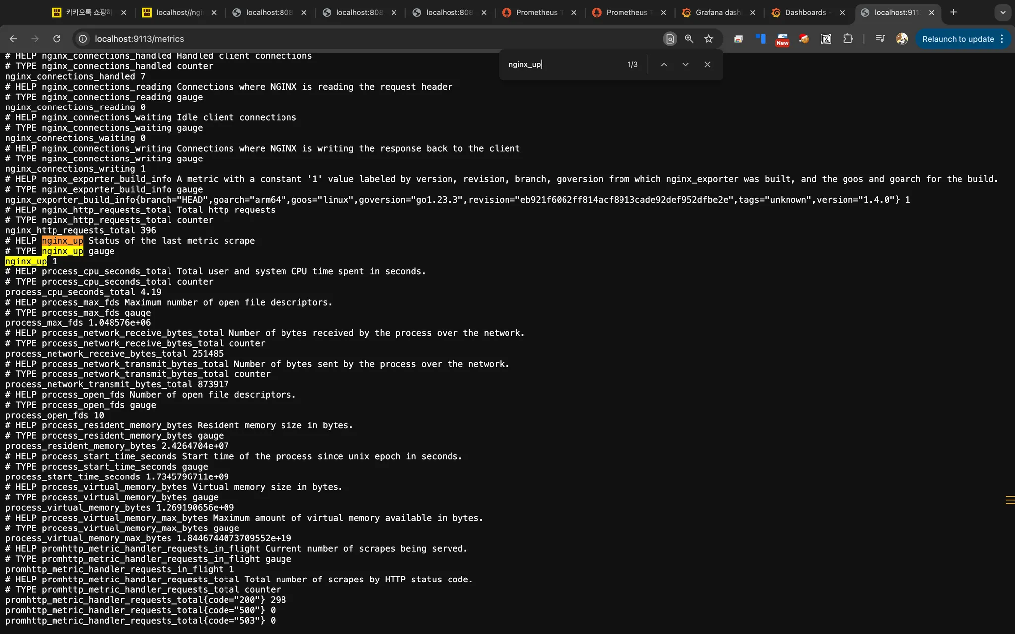 nginx_up 메트릭은 Nginx 상태를 나타냄. 값이 1이면 성공적으로 상태 정보를 가져옴.