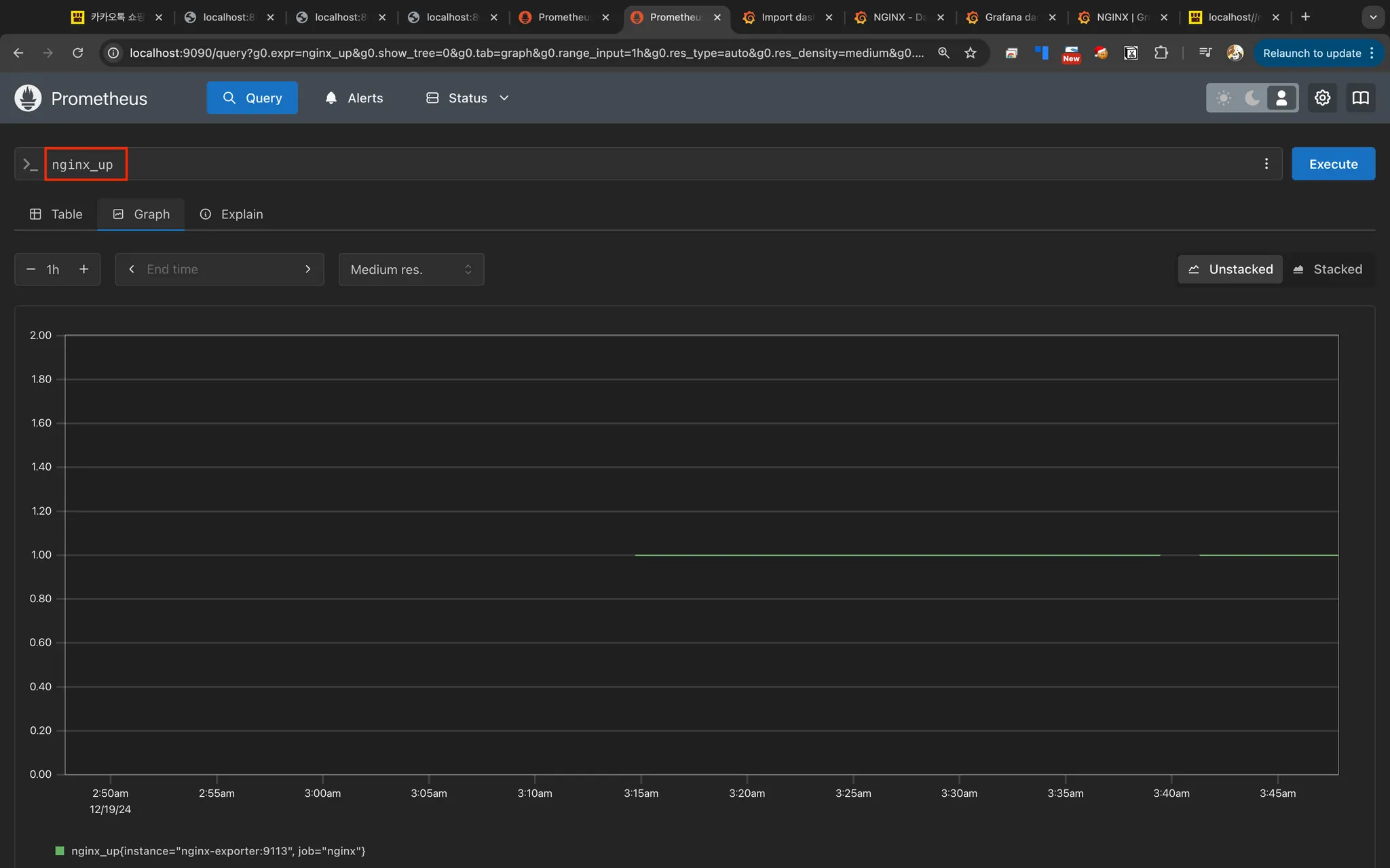nginx_up 쿼리를 실행하여 메트릭 스크랩의 상태를 표시한다. 성공(1), 실패(0)