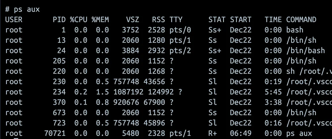 root 24 0.0 0.0 3884 2932 pts/2 Ss+ Dec22 0:00 /bin/bash