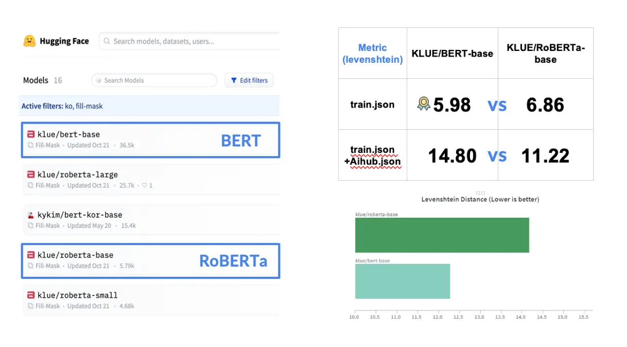 Pretrained 모델로 KLUE/BERT-base와 KLUE/RoBERTa-base를 사용하여 성능을 비교
