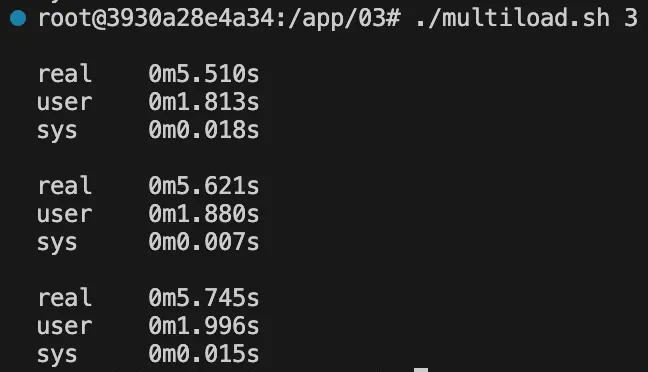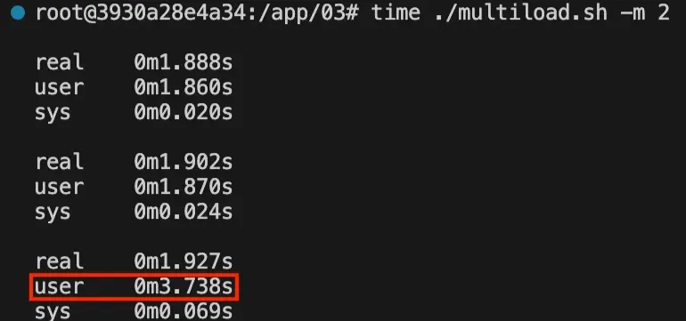 모든 프로세스의 real과 user + sys 값이 거의 같다. 이는 각 프로세스가 독립적으로 CPU 자원을 사용했음을 의미한다.