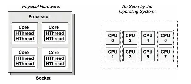 논리적 CPU는 각 코어가 동시에 2개 이상의 작업을 수행할 수 있는 능력을 의미한다. 이는 하이퍼스레딩(Hyper-Threading)기술을 통해 구현이 가능하다. 위 그림에서 1개 프로세서에 4개의 물리적 코어만 존재하지만, 하이퍼스레딩(Hyper-Threading)을 활성화하면 시스템은 이를 8개의 논리적 CPU로 인식하게 된다. 1P4C with 2 Threads per core