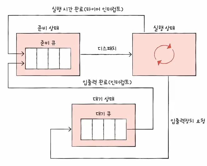 대기 중인 프로세스는 작업이 완료되면 준비 큐로 다시 이동한다.