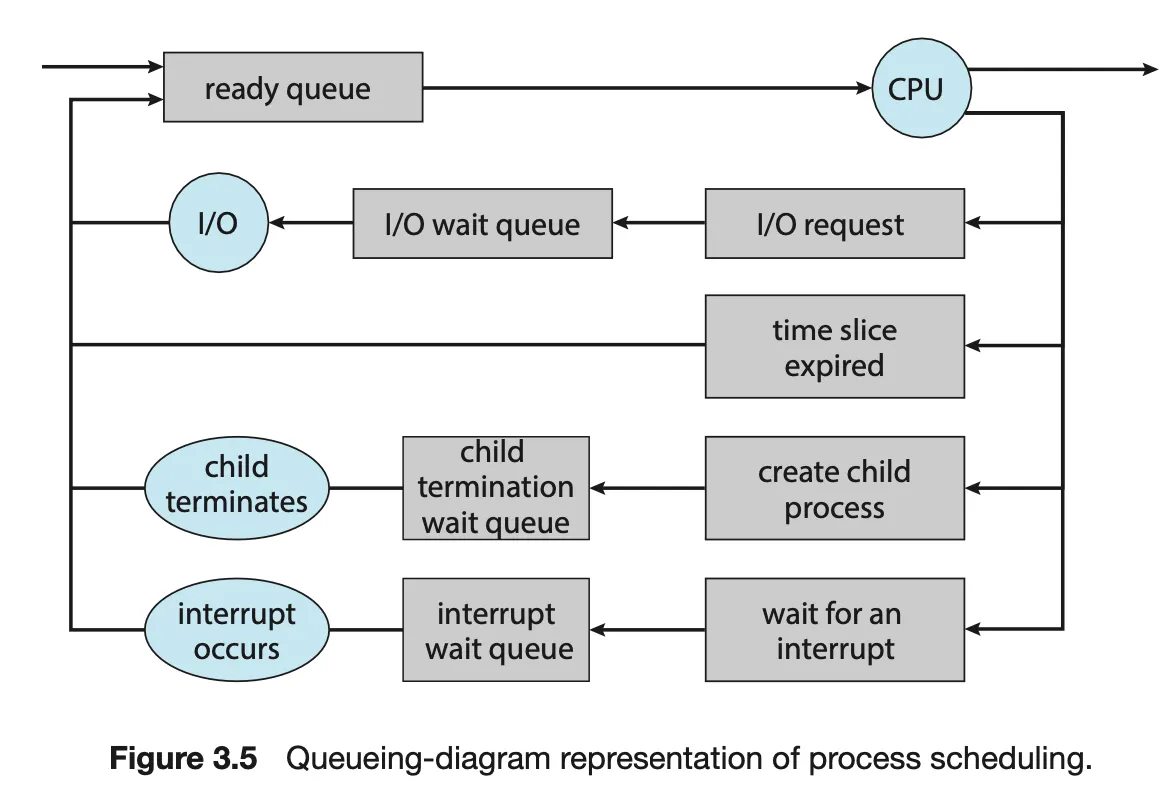 생성된 프로세스는 준비큐(Ready Queue)에 들어가며, CPU에 실행할 차례를 기다린다. 프로세스가 CPU할당을 받아 실행 중(running)일 때는 다음과 같은 이벤트에 따라 상태와 큐가 변경된다.