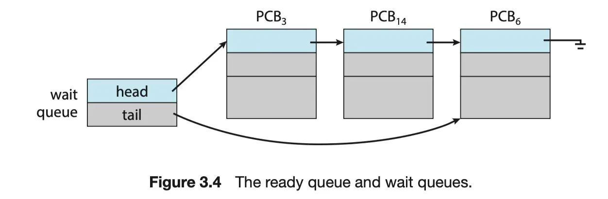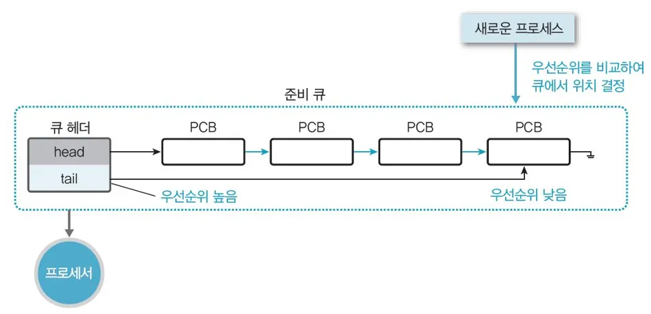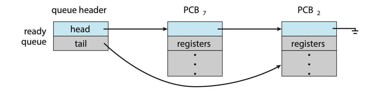 준비 큐의 헤더는 리스트의 첫 번째 PCB를 가리키며, 각 PCB는 다음 PCB에 대한 포인터 필드를 가리킨다.